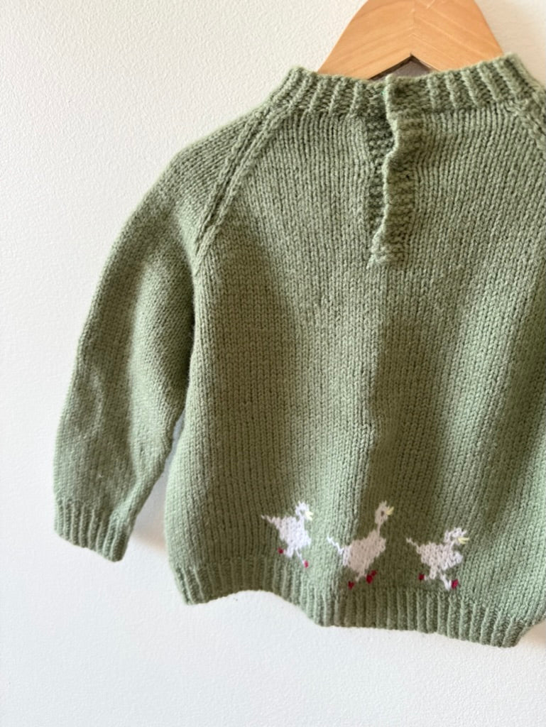 Handknit Green Ducks Sweater • 1-2 years