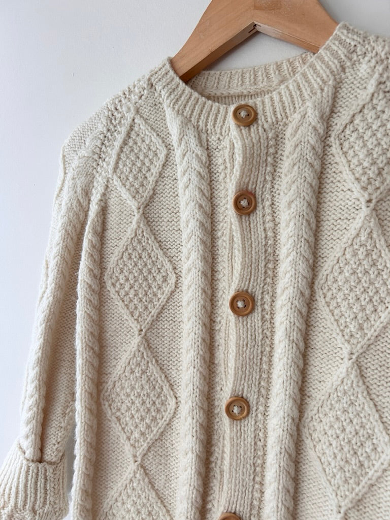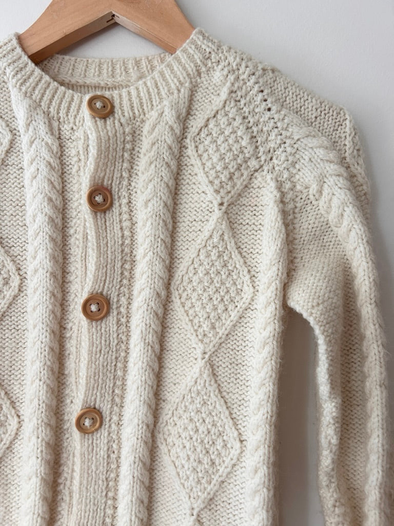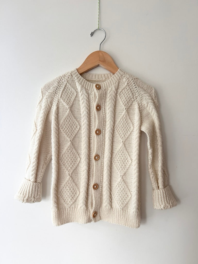 Handknit White Acrylic Wooden Button Cardigan • 4-6 years *