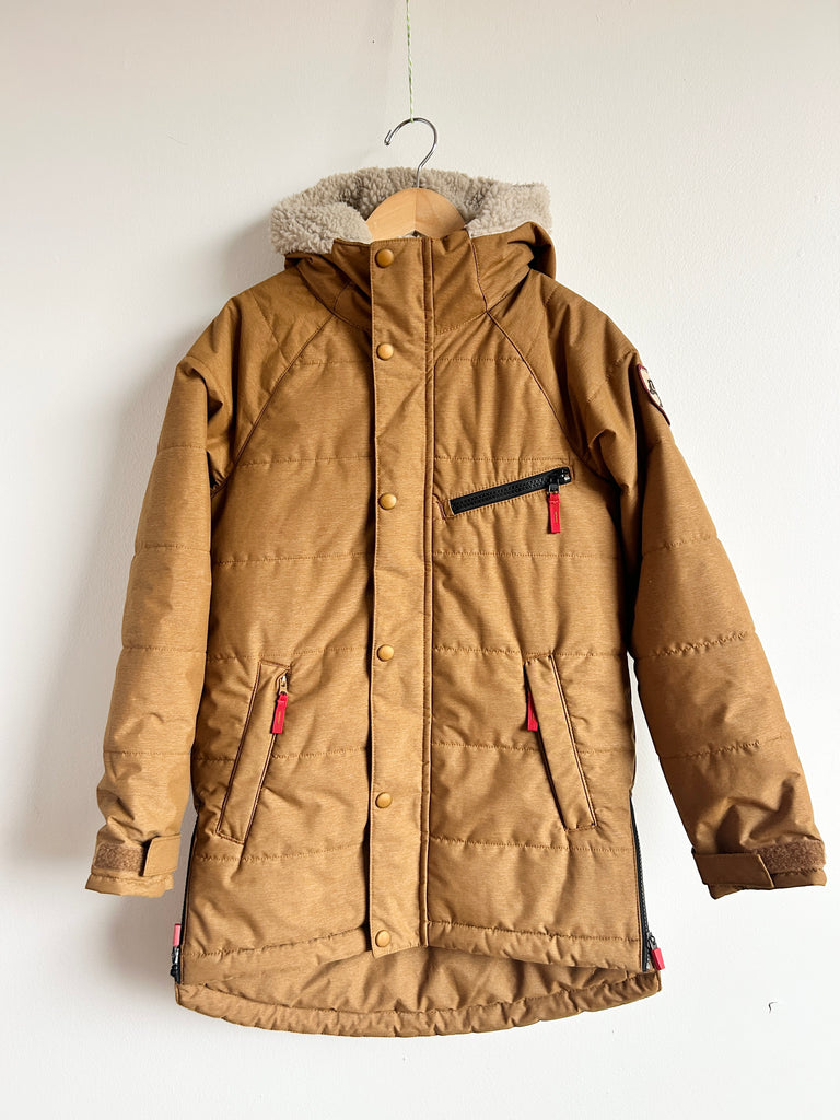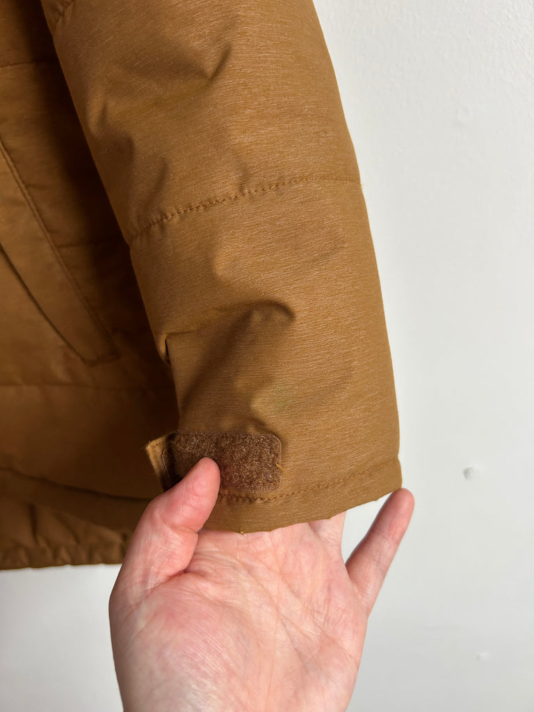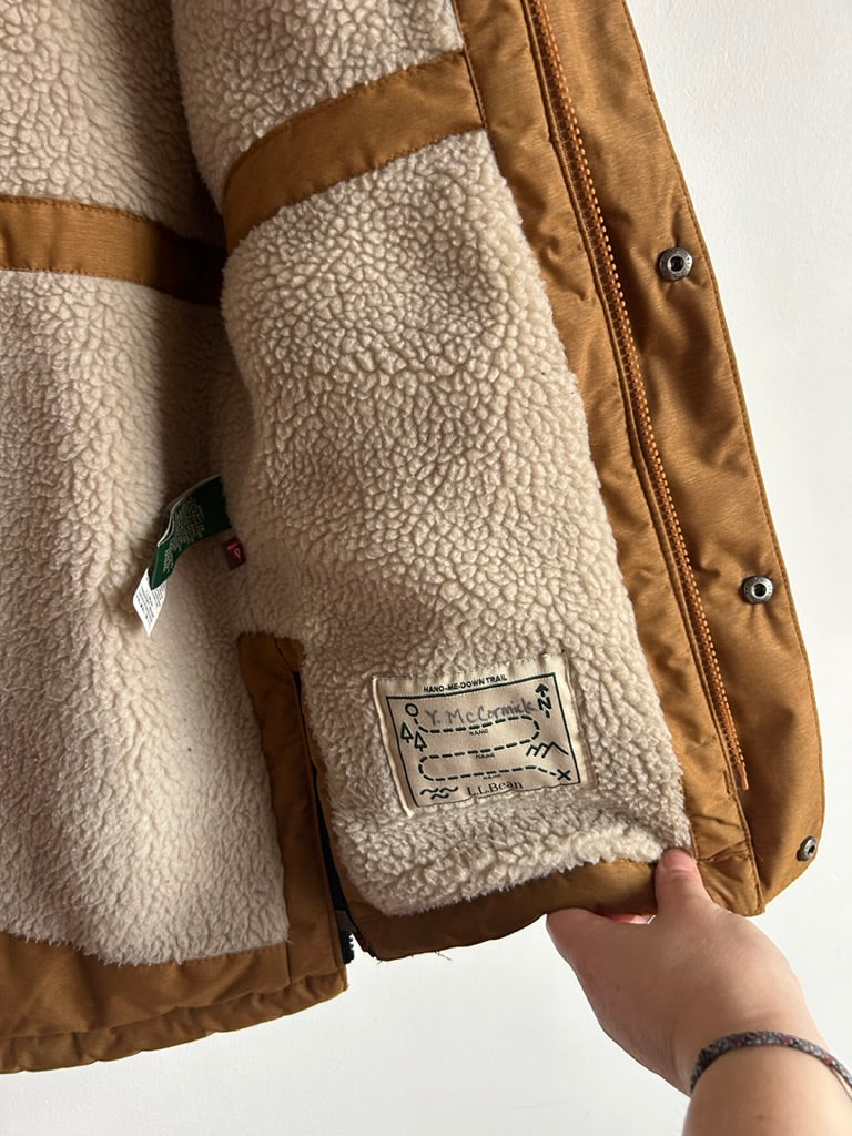 Great, a bit of wear on the sherpa. Nothing major marks wise, a bit of wear on the inner sherpa. This is sold out but similar ones go for between $240 and $300 online. I'd rate this 8/10 condition. Poly outer, poly filled.