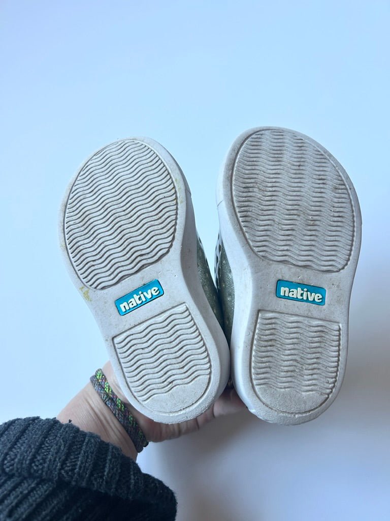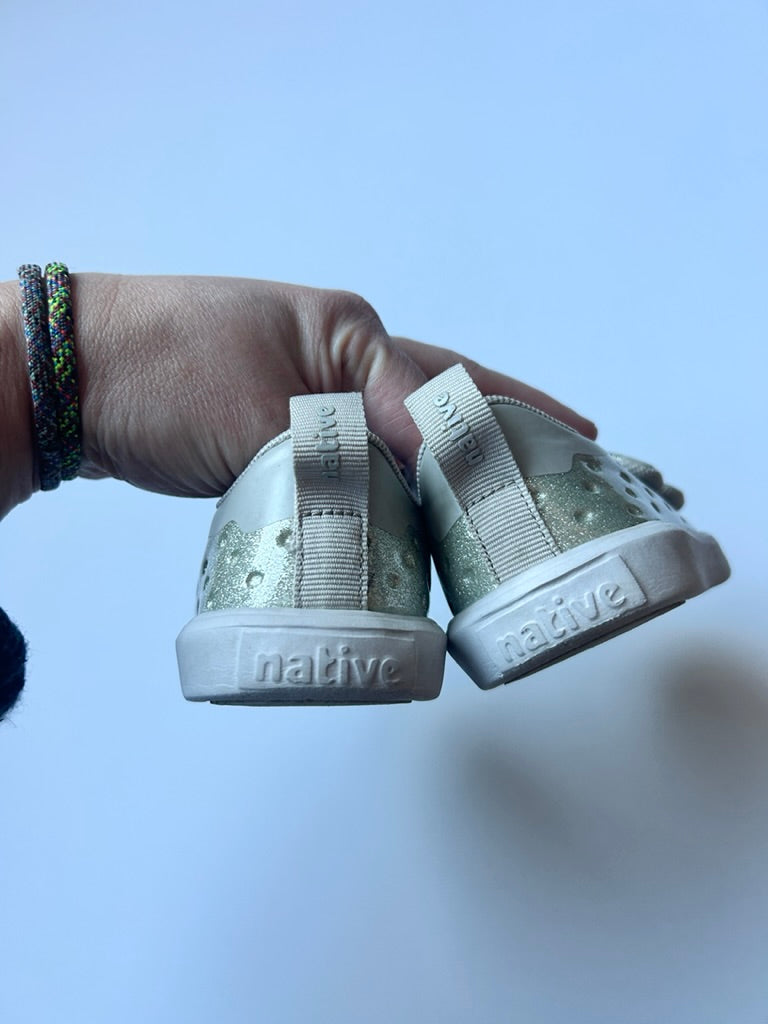 Good, small amount of wear. This would be perfect as daycare shoes? Or fun everyday shoes?? So sparkly!