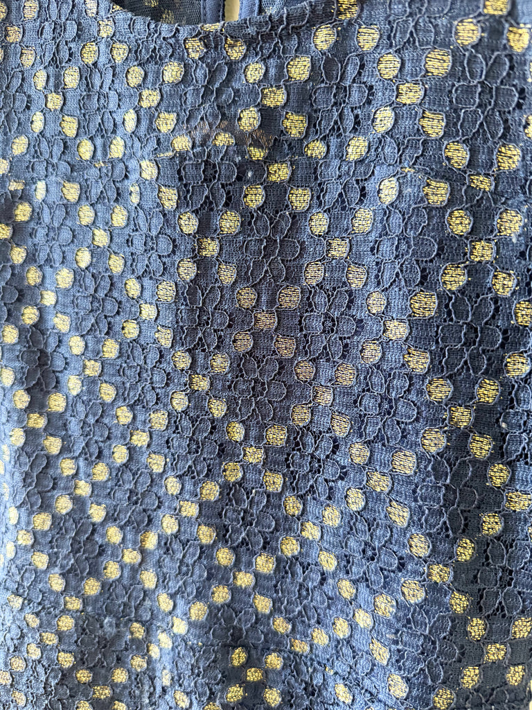 Great, minor wash wear, minor pilling. No stains or rips. This is really pretty! Nice eyelet detail. Labelled as an 8 but looks flexible.