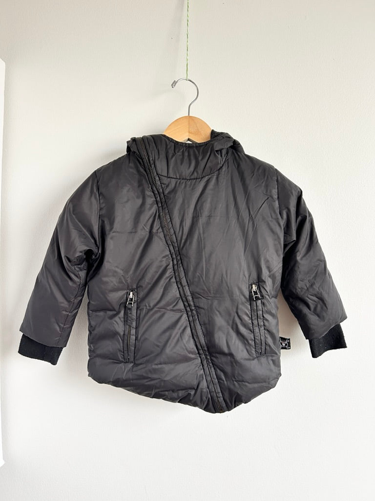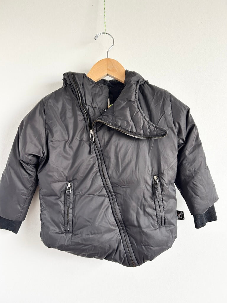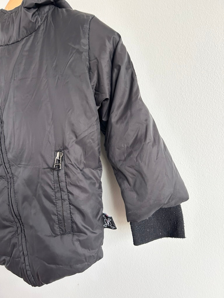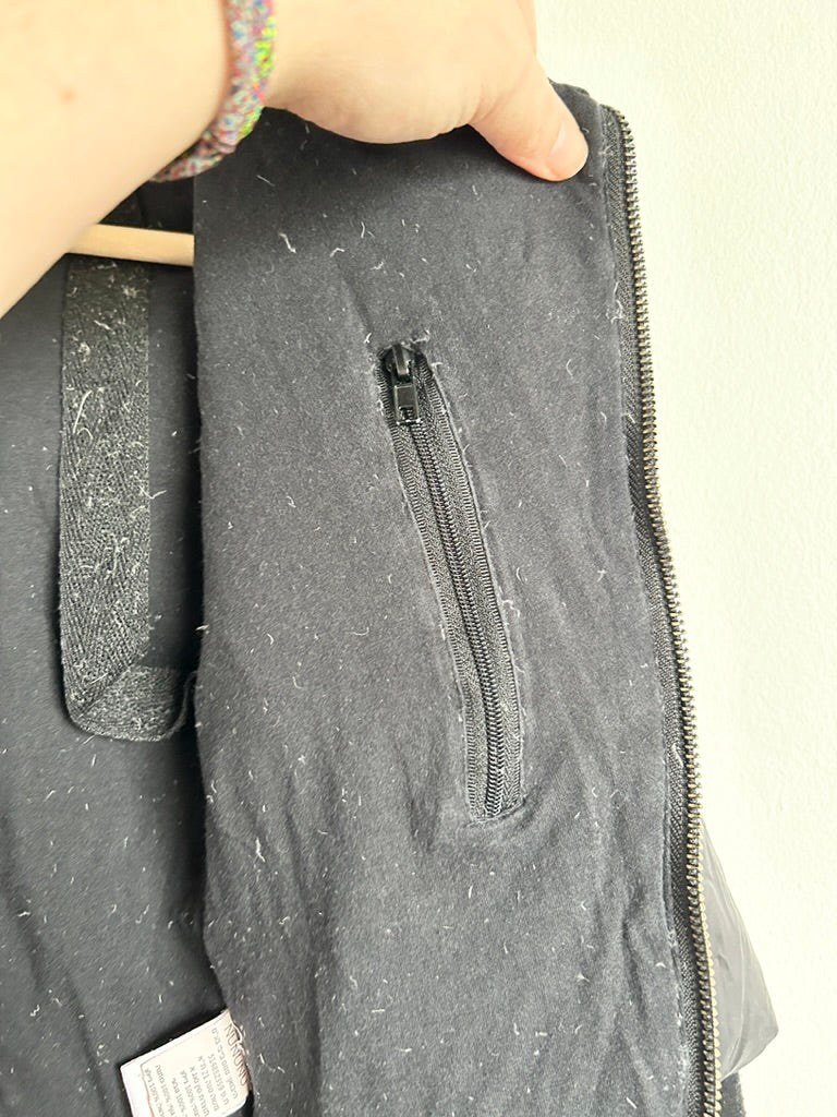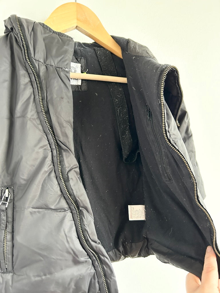 Good. Minor wear/pilling on the cuffs and a couple small marks where the zipper pulls. This is down filled. RRP around $250. As you can see this has some loose feathers inside the lining but no holes